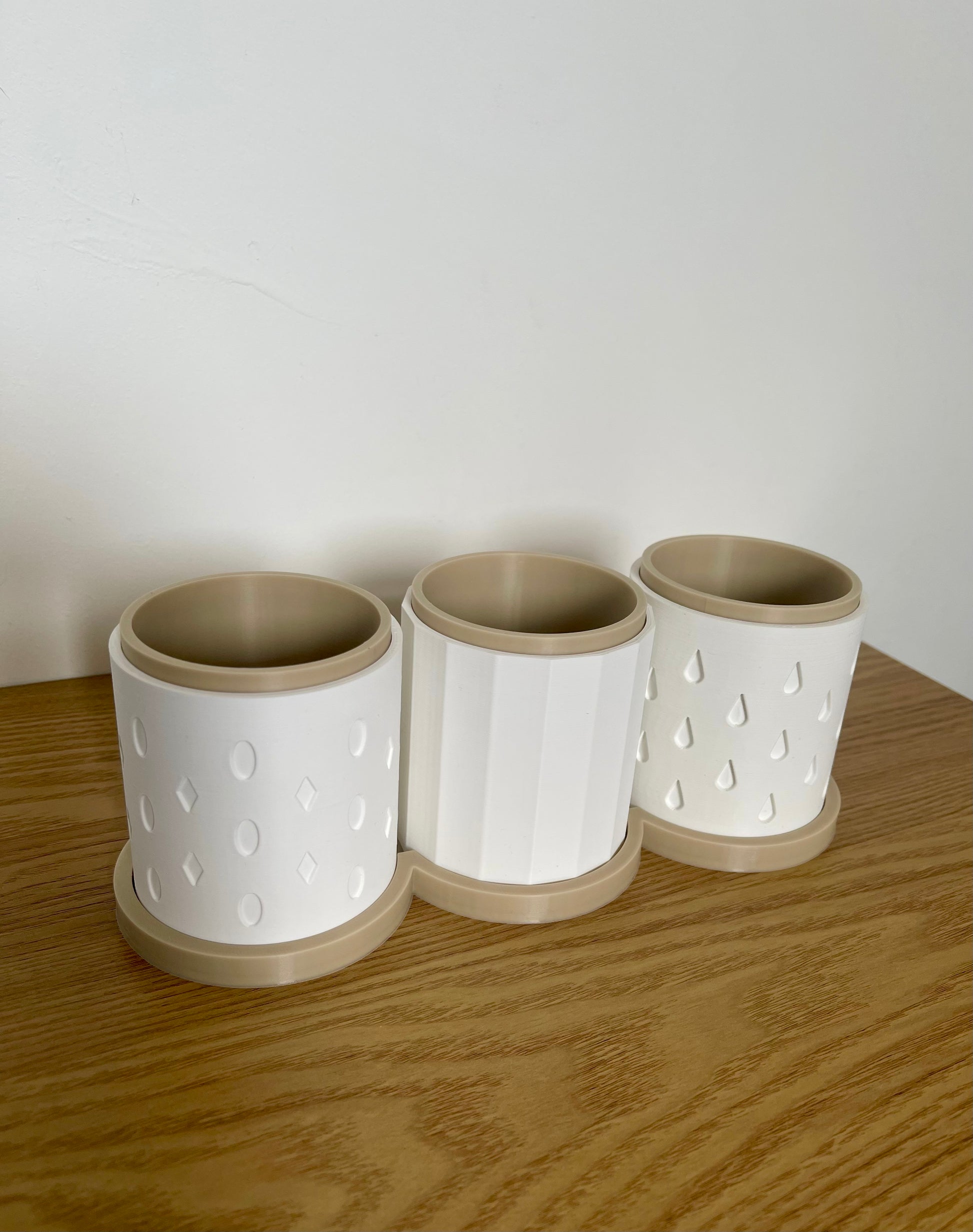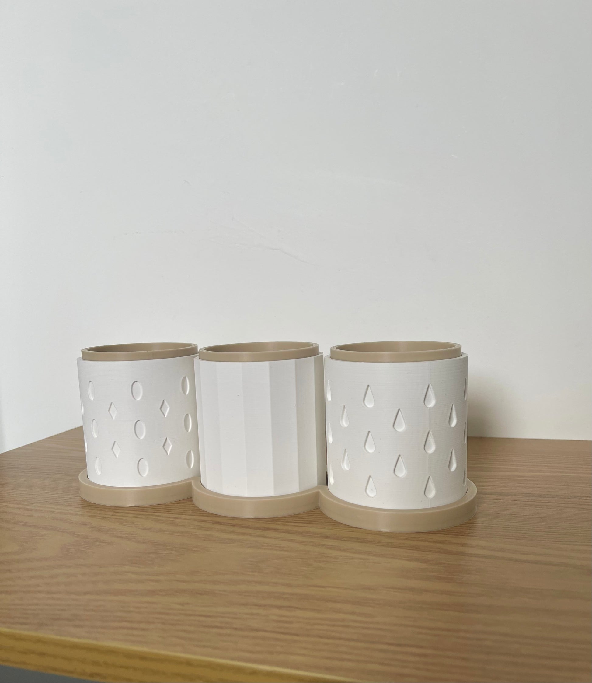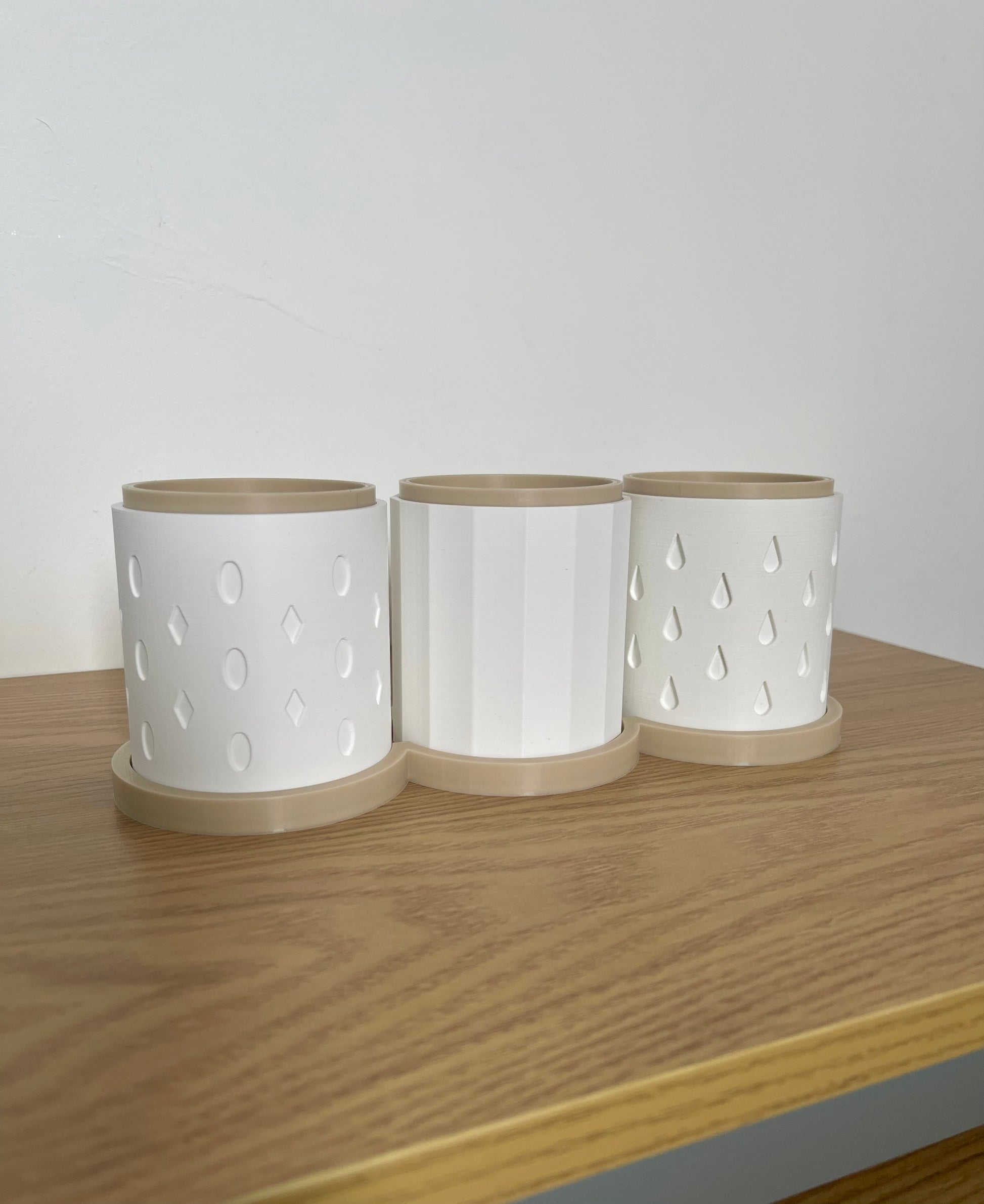 Each set includes three coordinated planters with subtle geometric and droplet designs, complete with matching bases to display them in. Whether you love fresh mint for teas, rosemary for cooking, or a variety of indoor plants, this set is both practical and decorative.