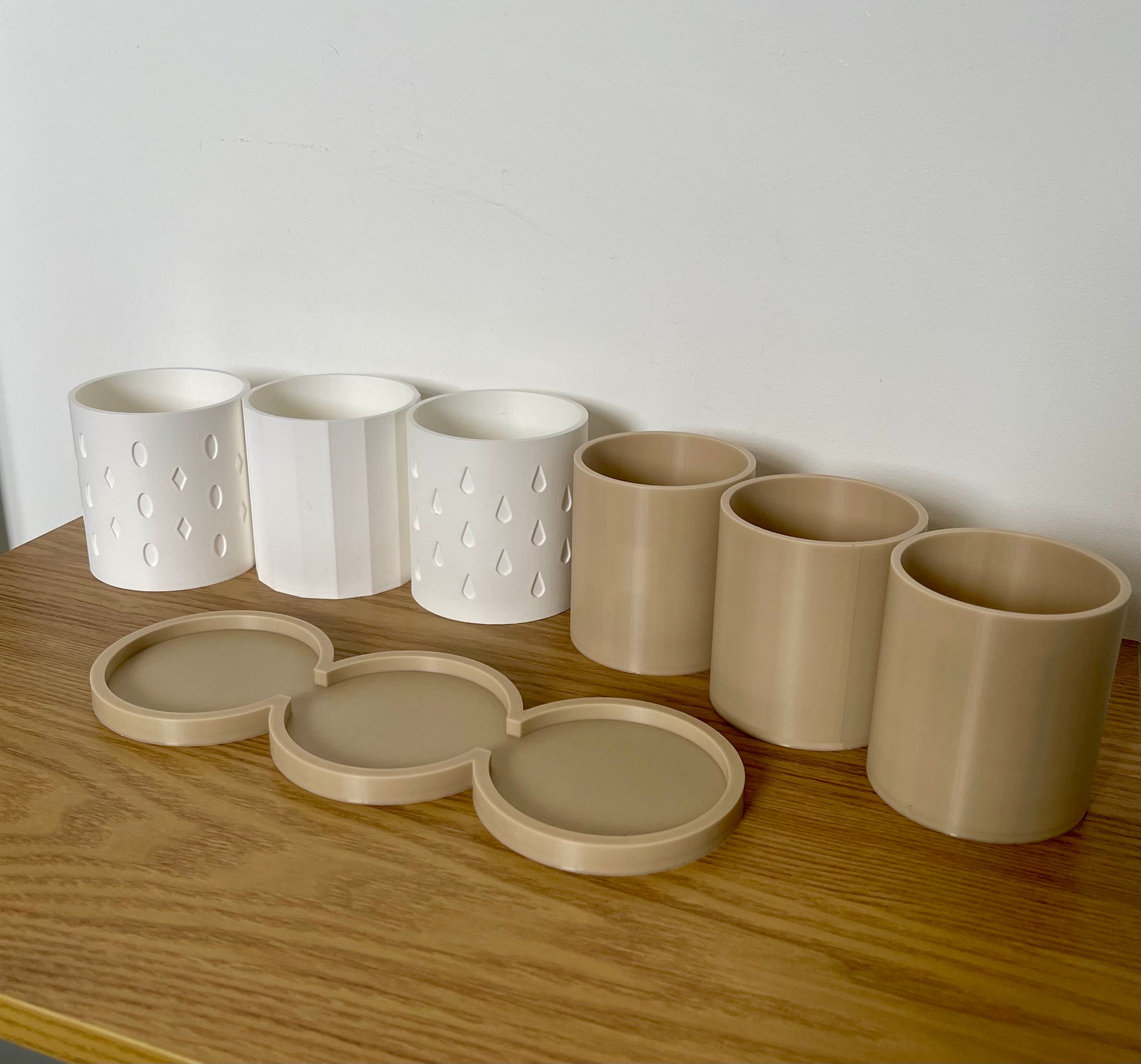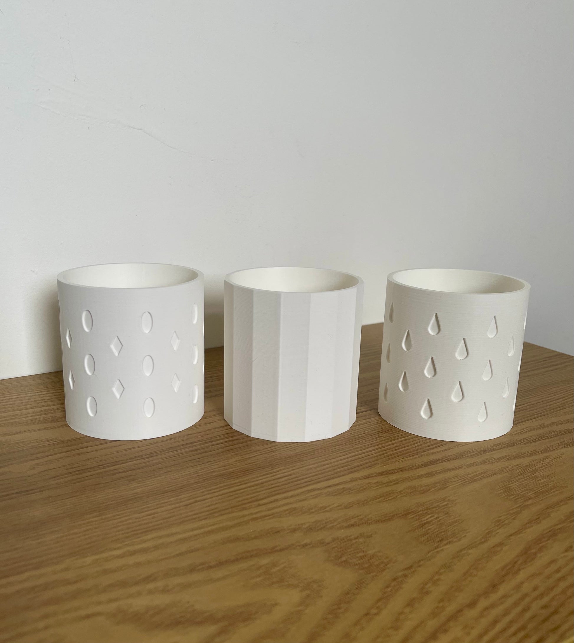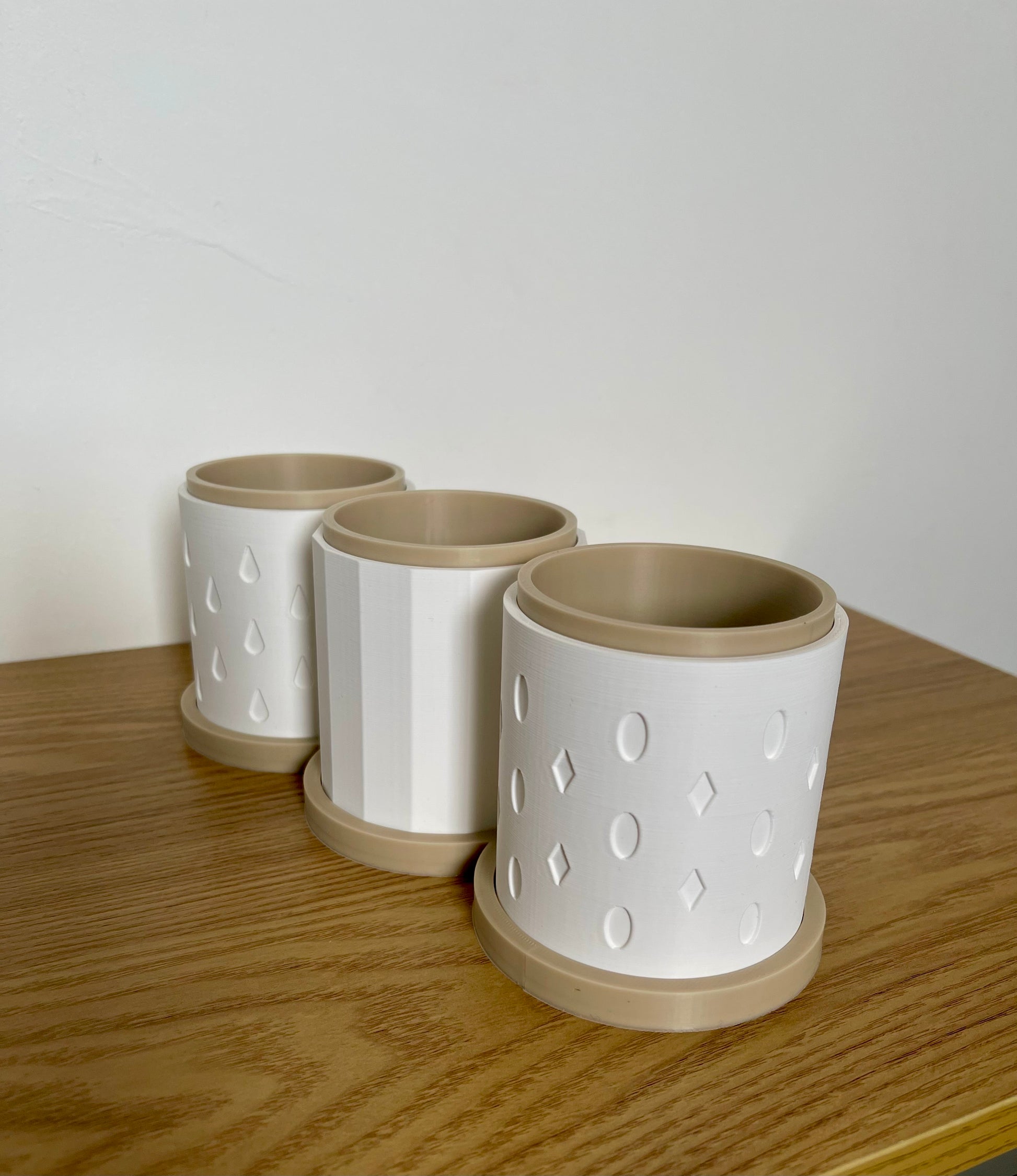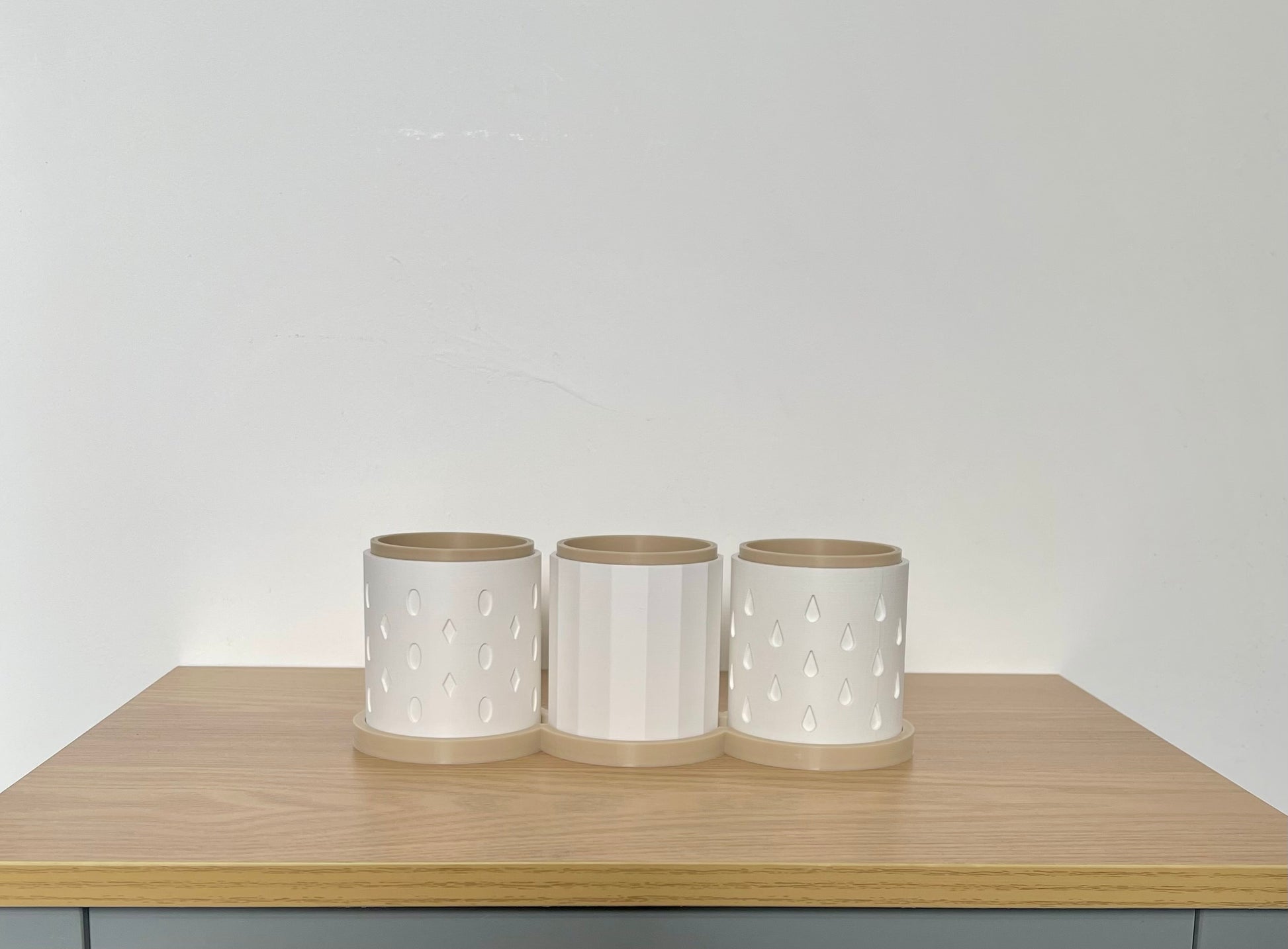 Each set includes three coordinated planters with subtle geometric and droplet designs, complete with matching bases to display them in. Whether you love fresh mint for teas, rosemary for cooking, or a variety of indoor plants, this set is both practical and decorative.