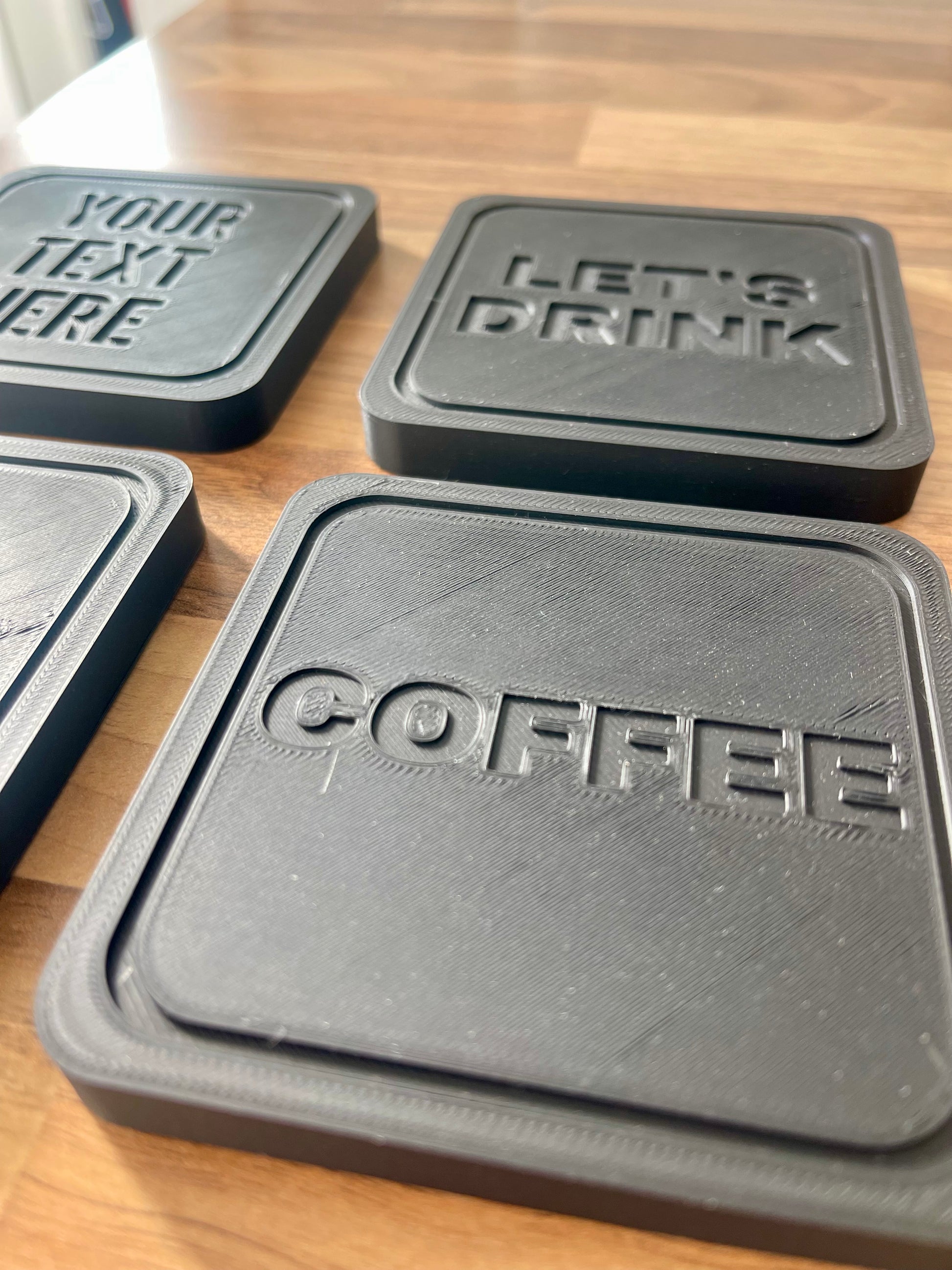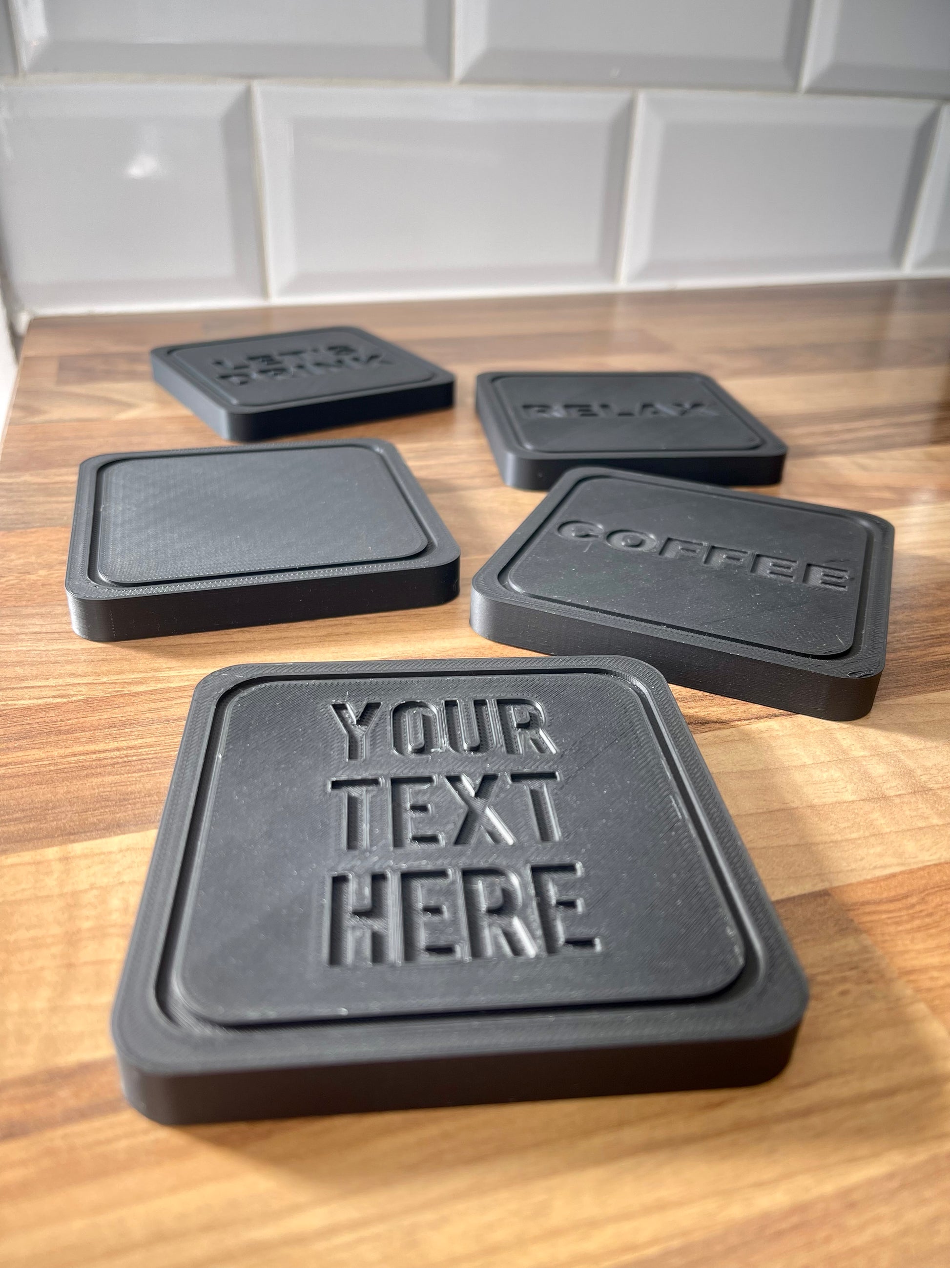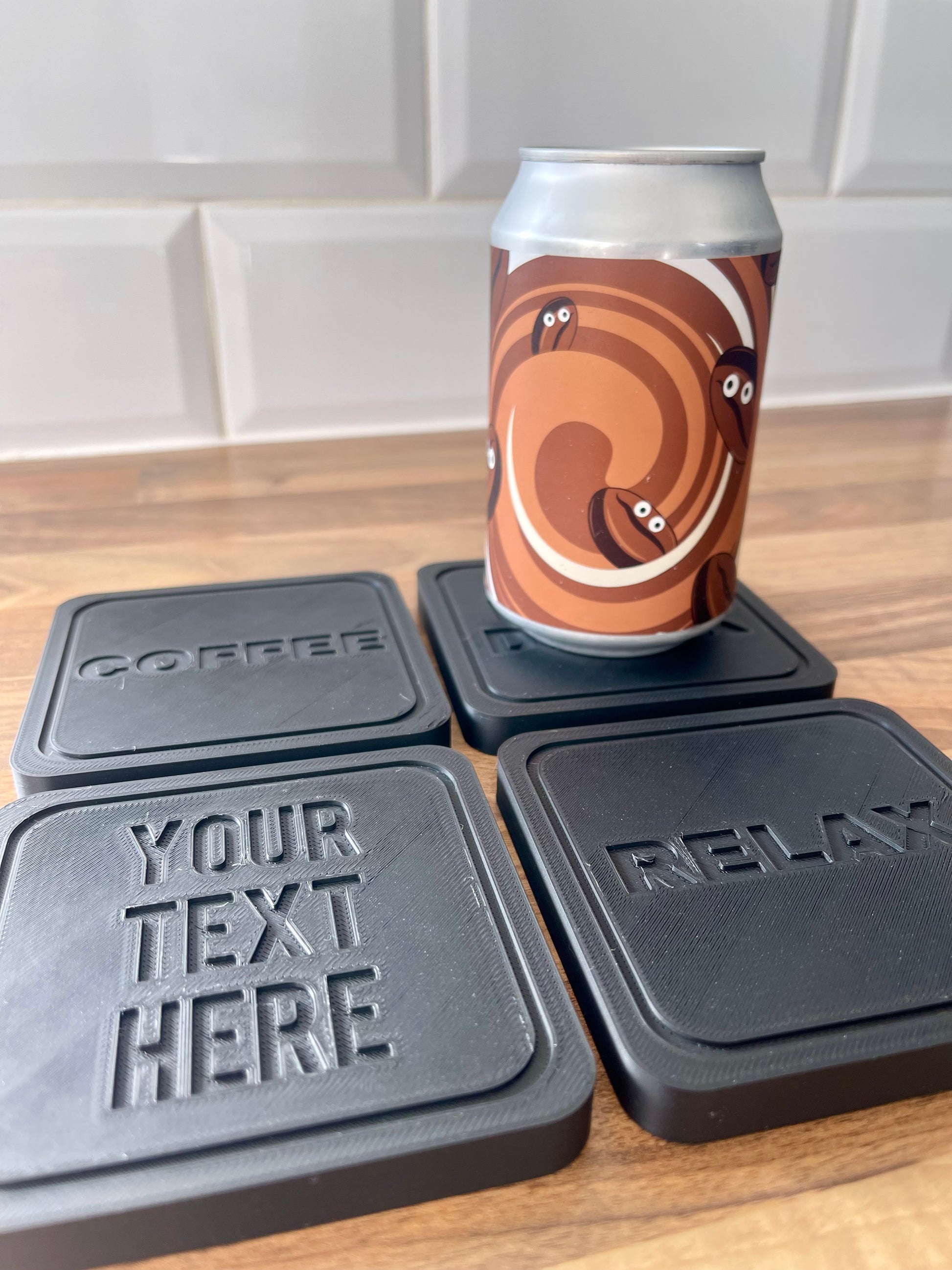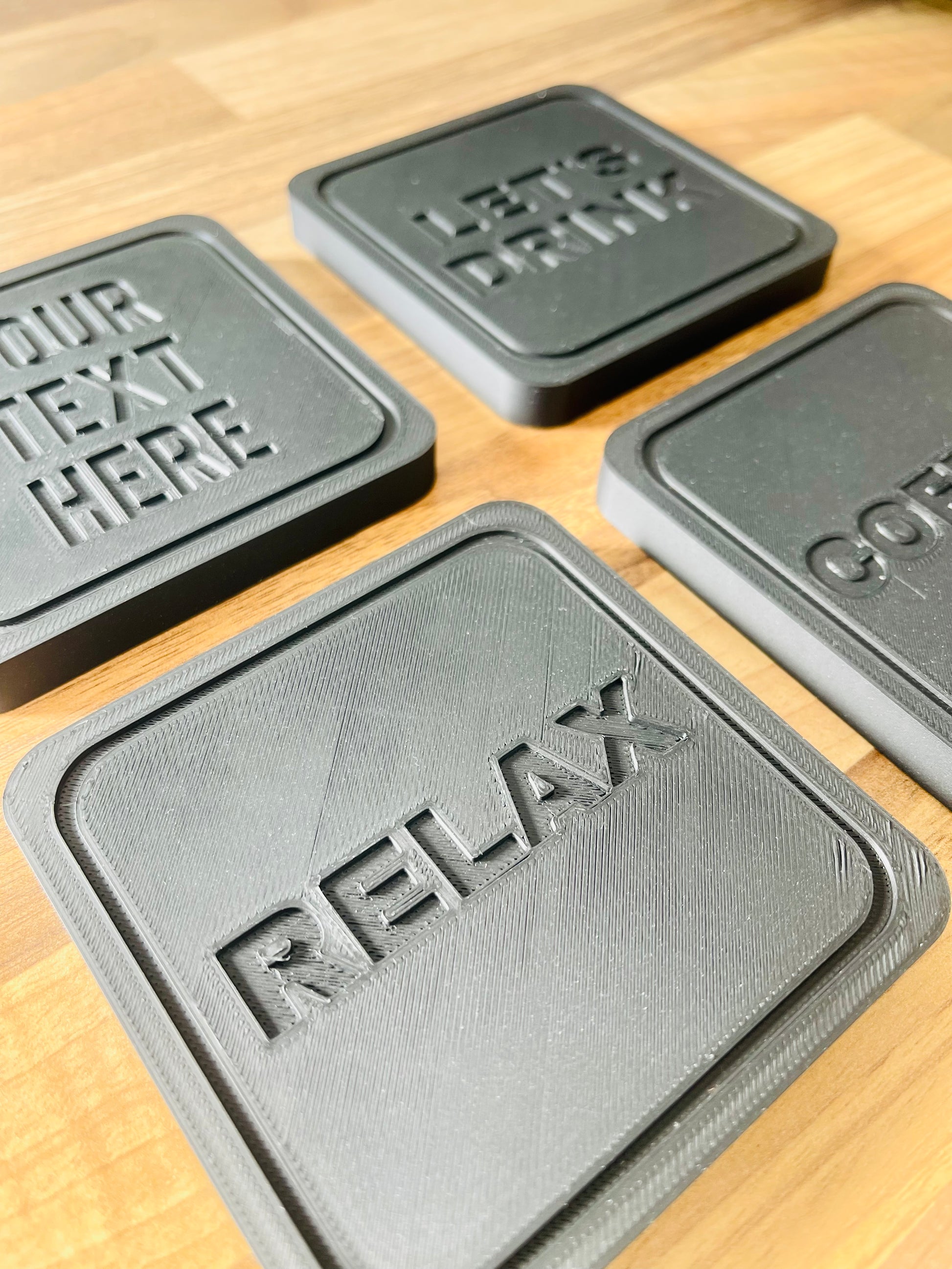 Add a personal touch to your coffee table with these sleek and modern 3D printed coasters. Perfect for your morning brew, evening wine, or as a thoughtful gift, these square coasters can be customised with any text of your choice – names, quotes, initials, or just plain stylish simplicity.