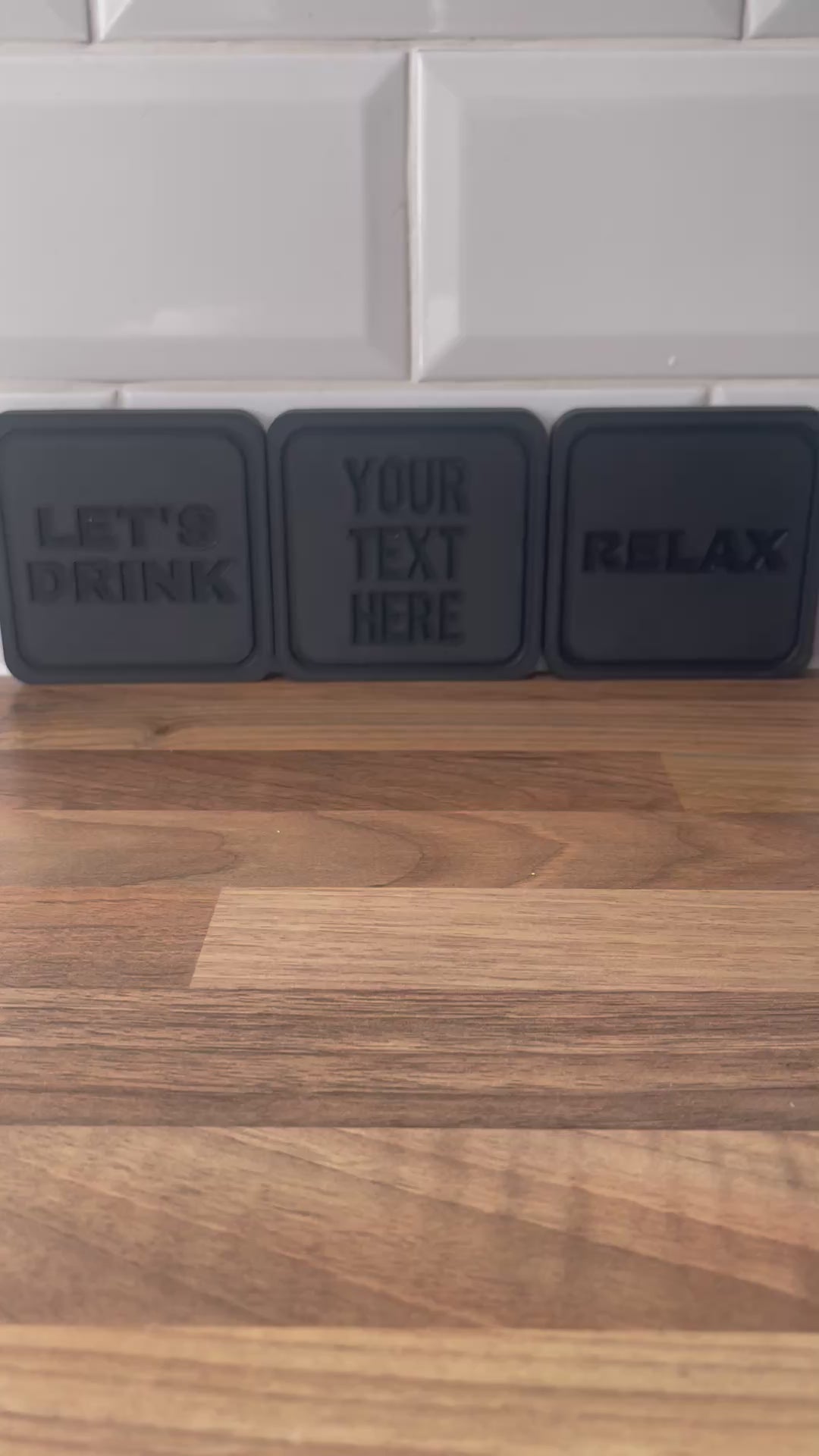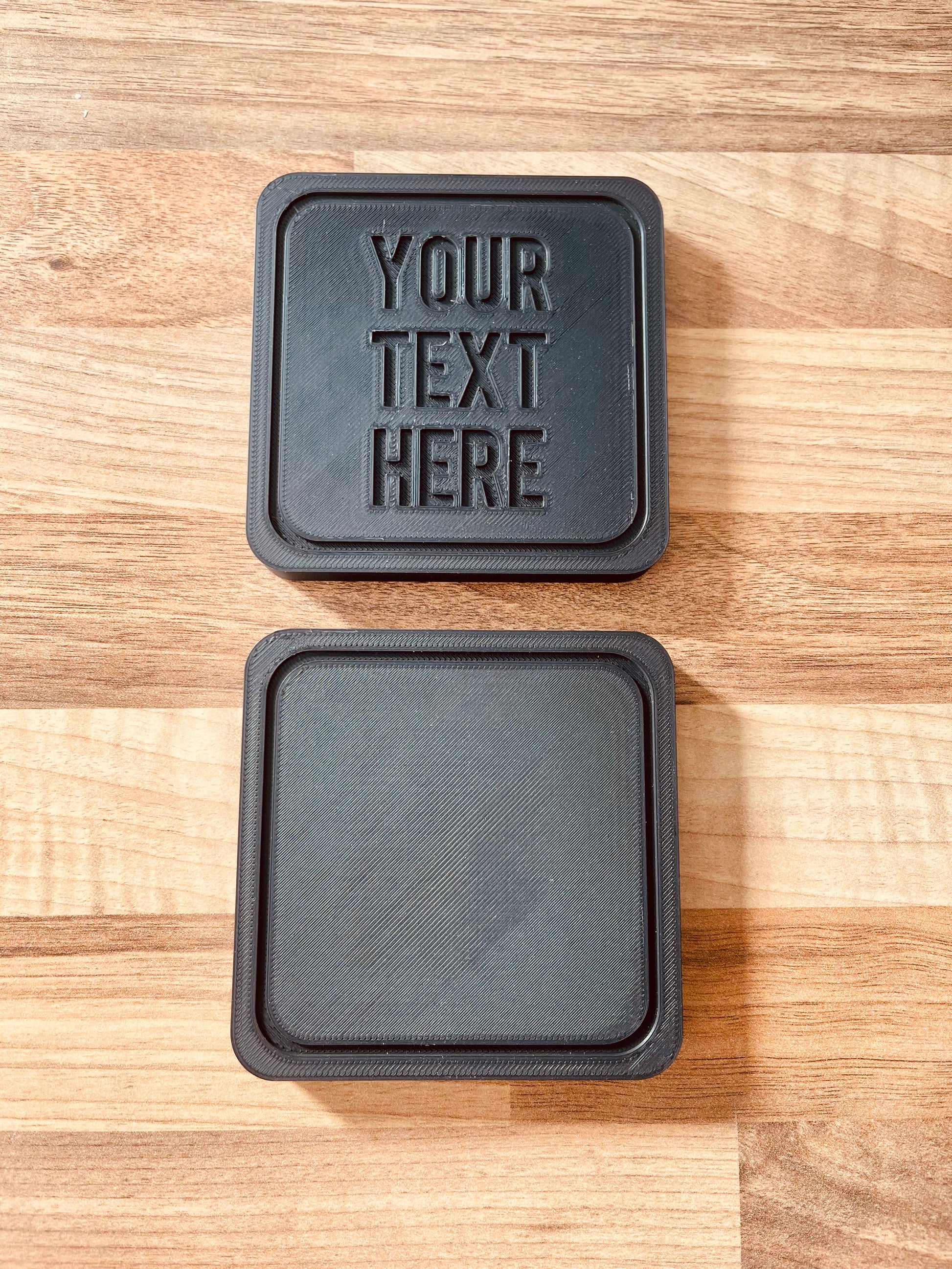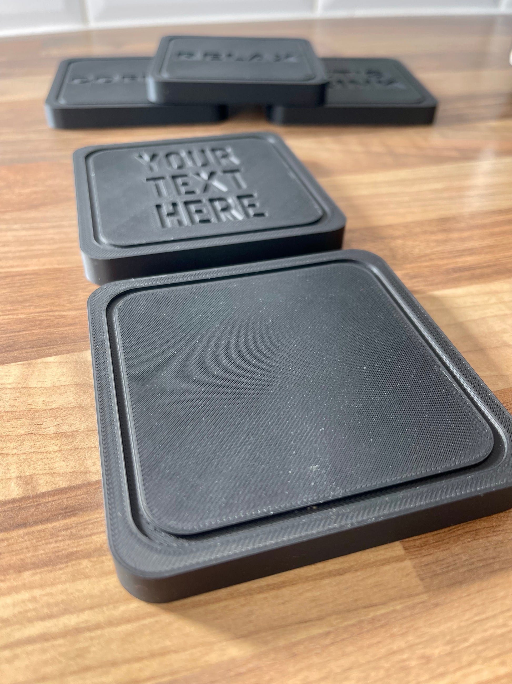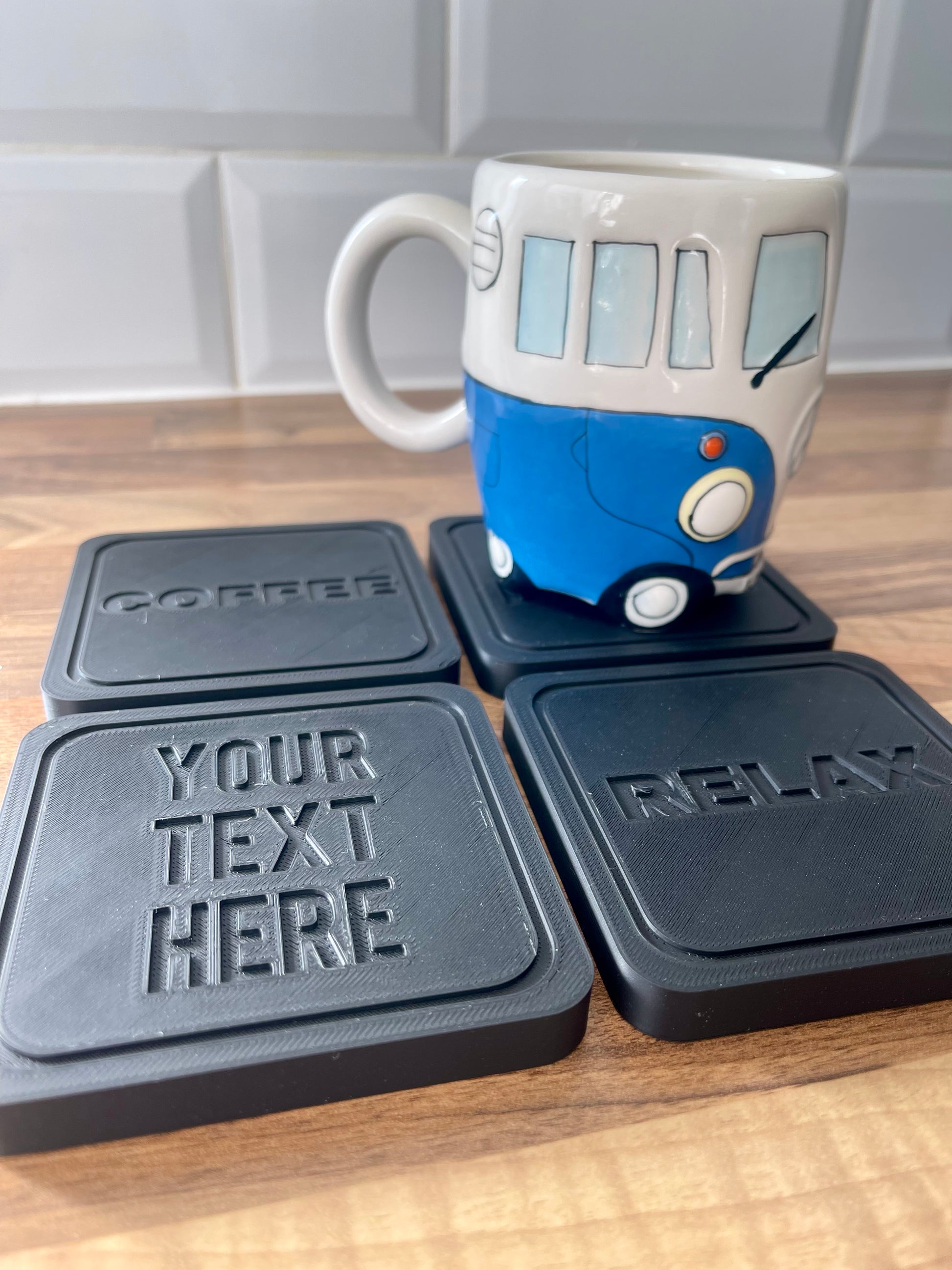 Add a personal touch to your coffee table with these sleek and modern 3D printed coasters. Perfect for your morning brew, evening wine, or as a thoughtful gift, these square coasters can be customised with any text of your choice – names, quotes, initials, or just plain stylish simplicity.