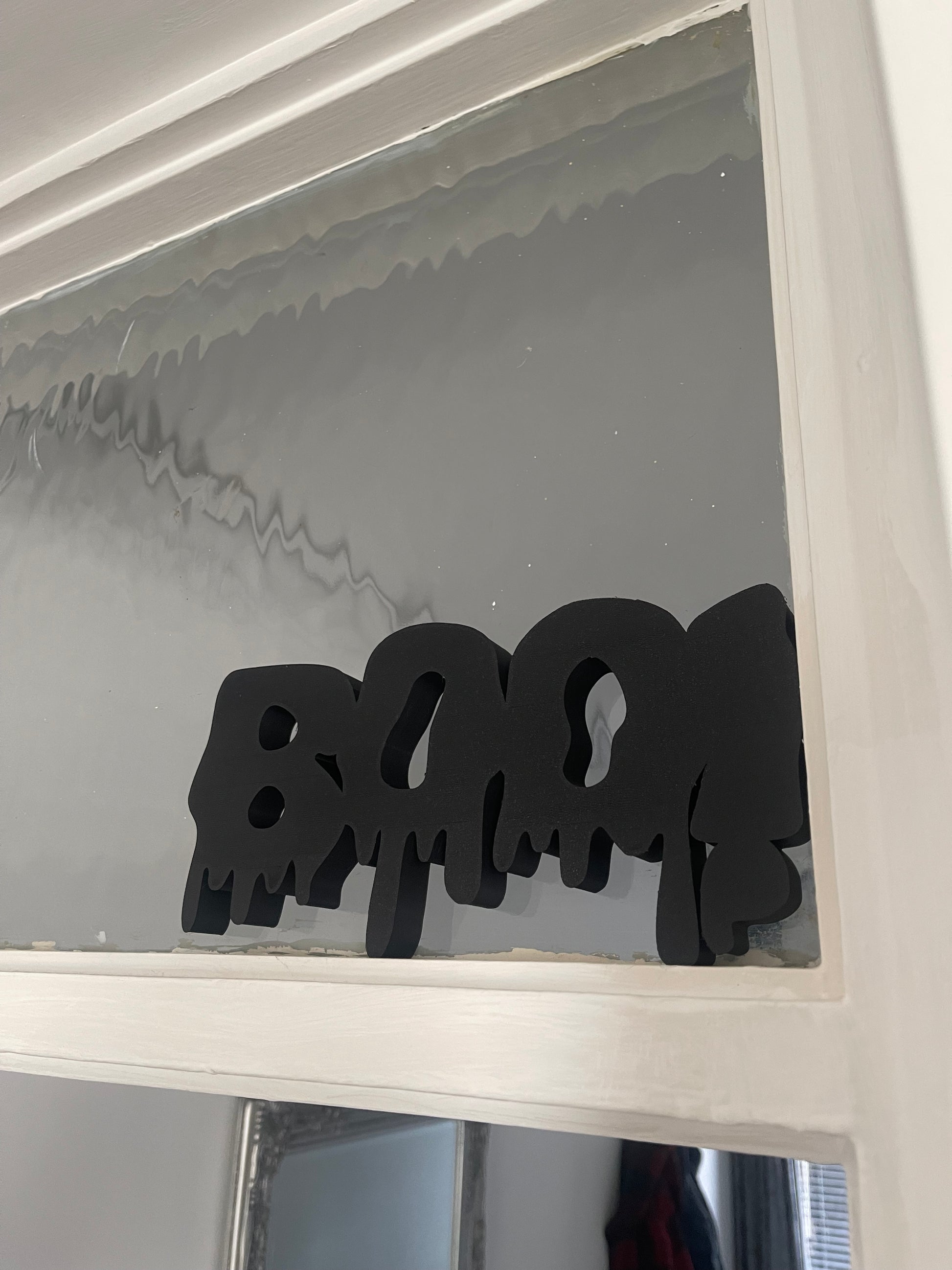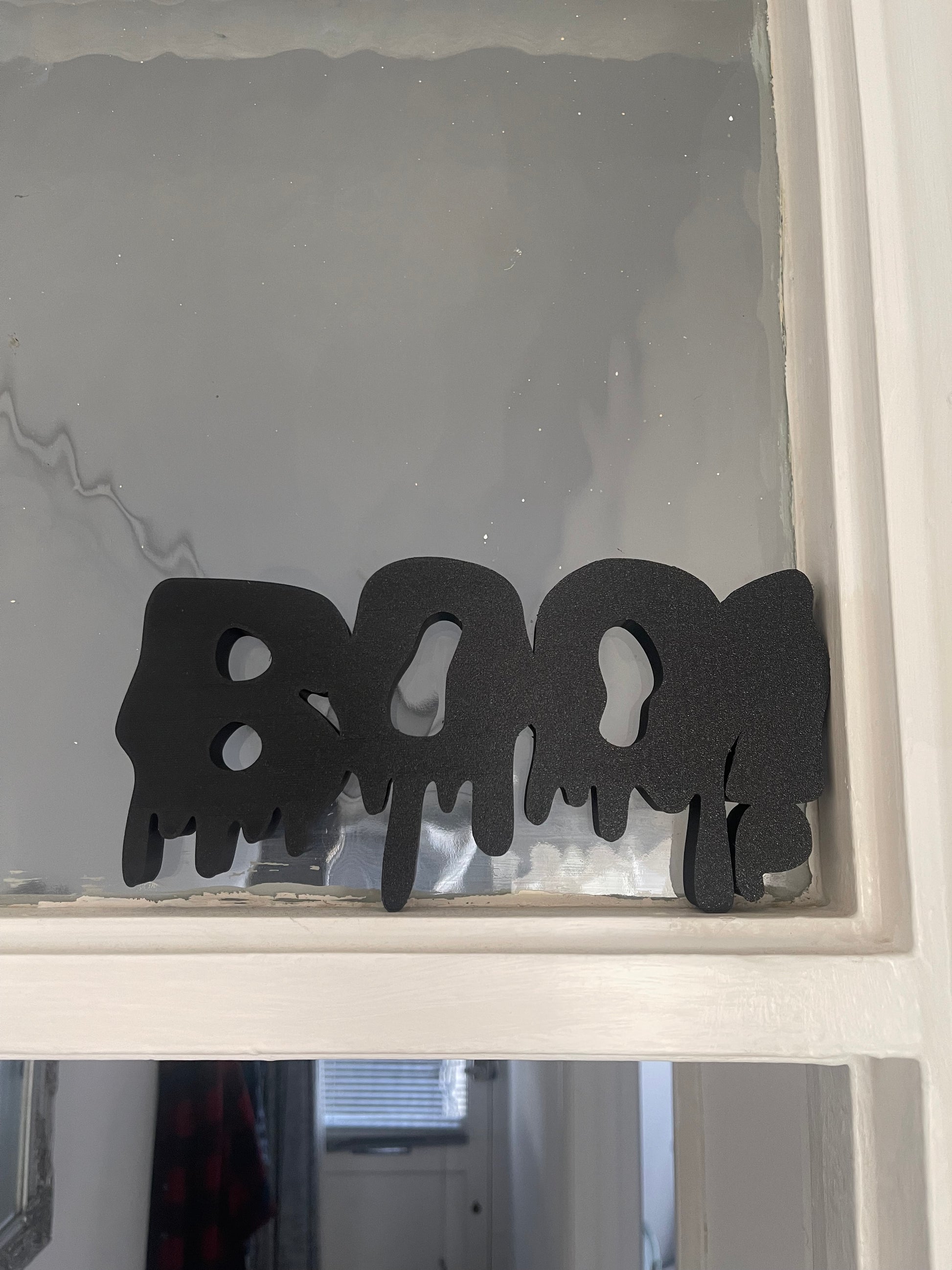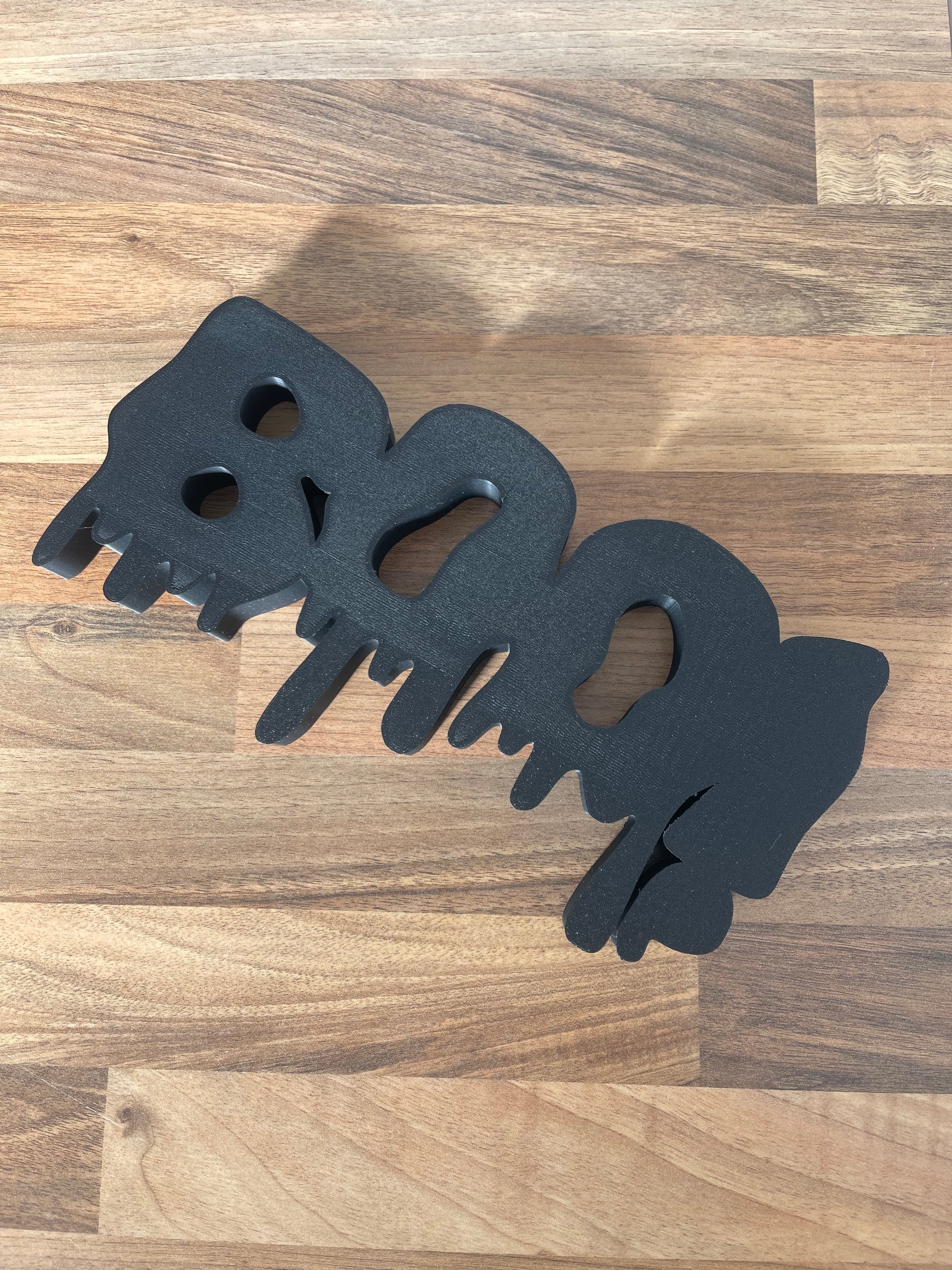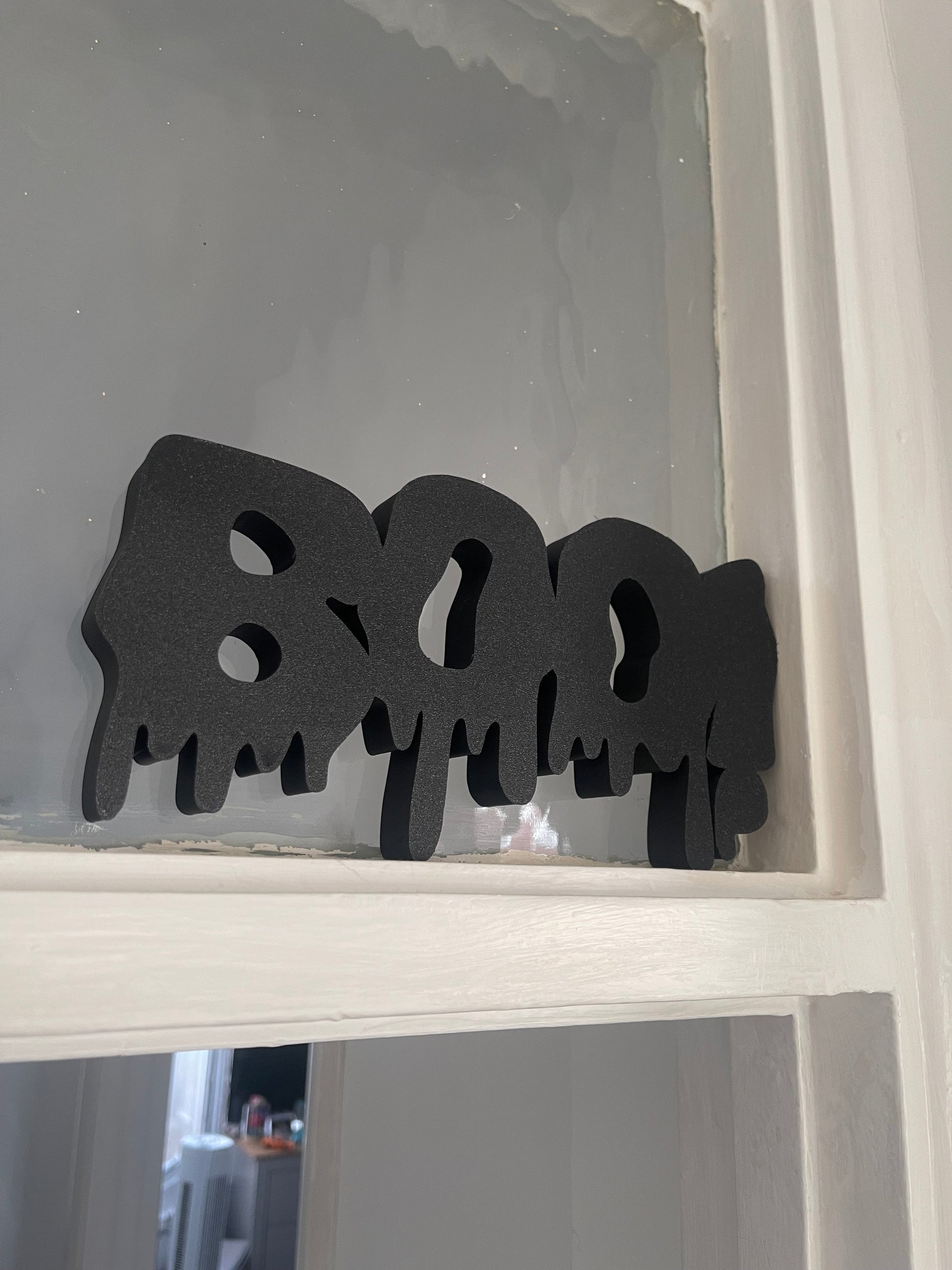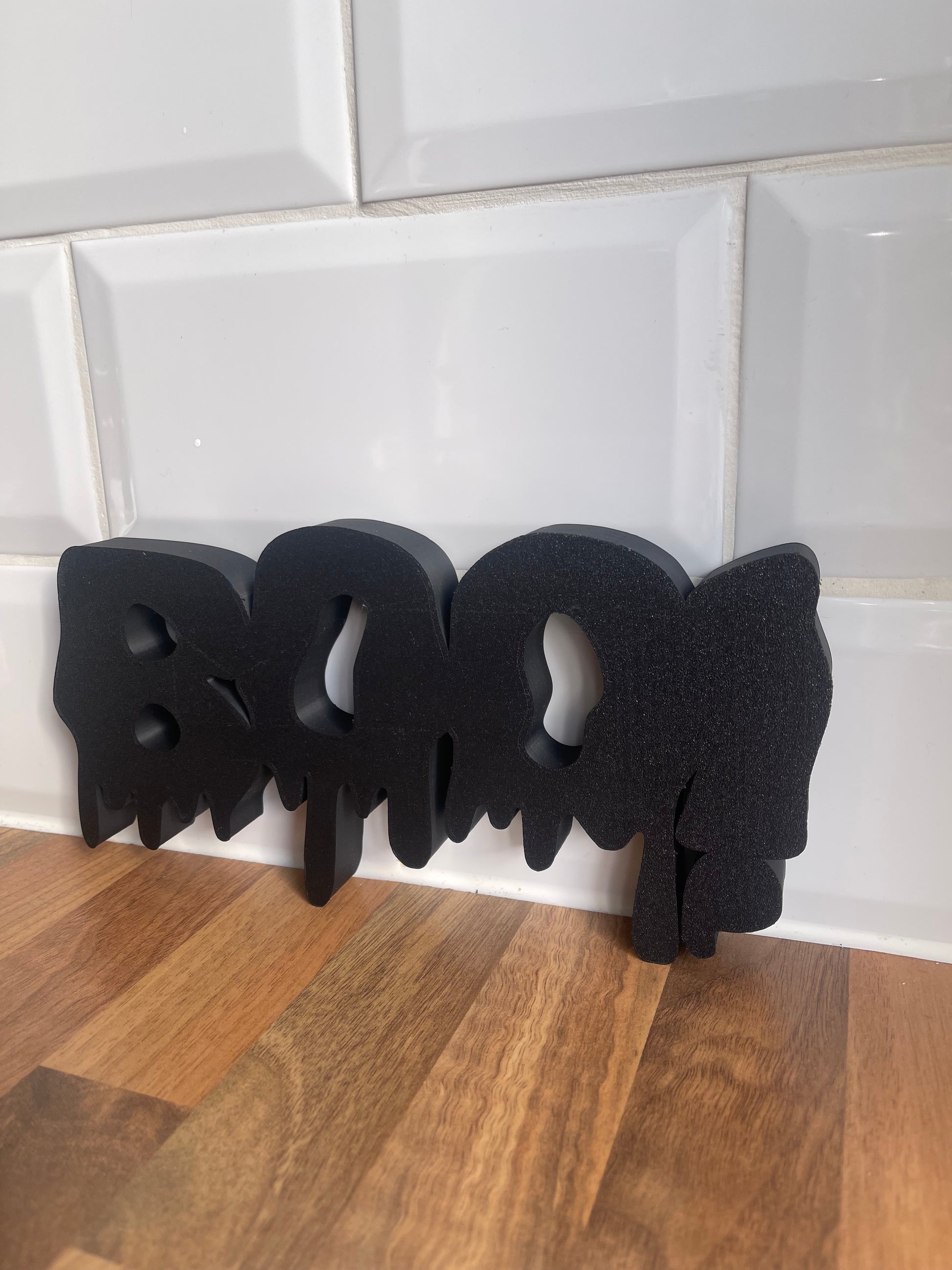 Get your home ready for spooky season with this bold BOO! Halloween sign – perfect for adding a touch of frightful fun to your decor. Designed with a unique dripping effect, this piece is 3D printed in durable black plastic, making it lightweight yet sturdy.