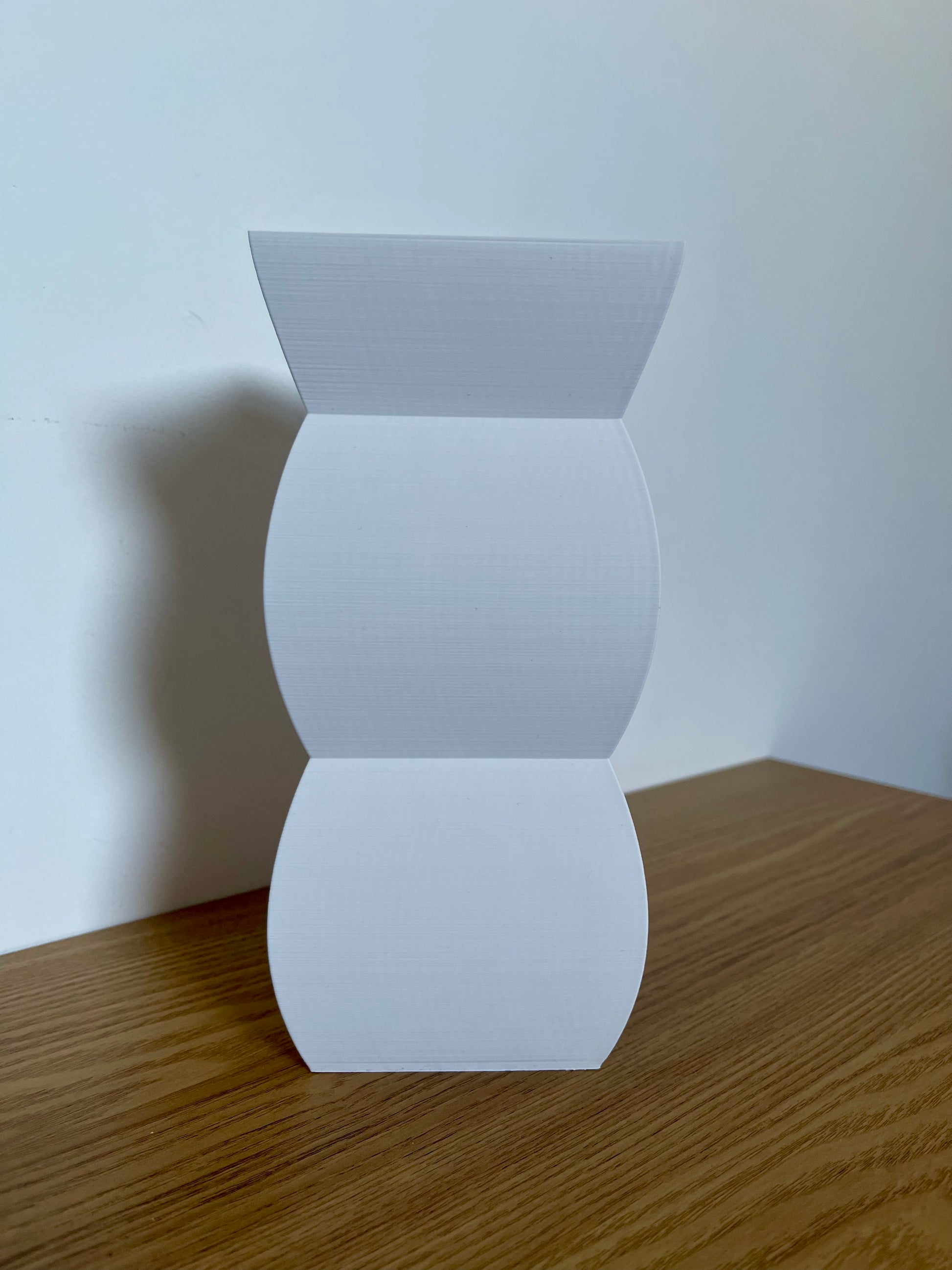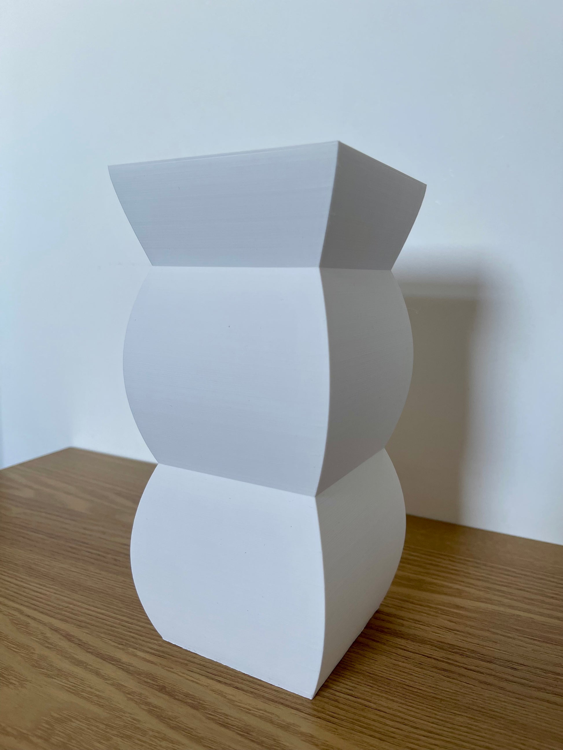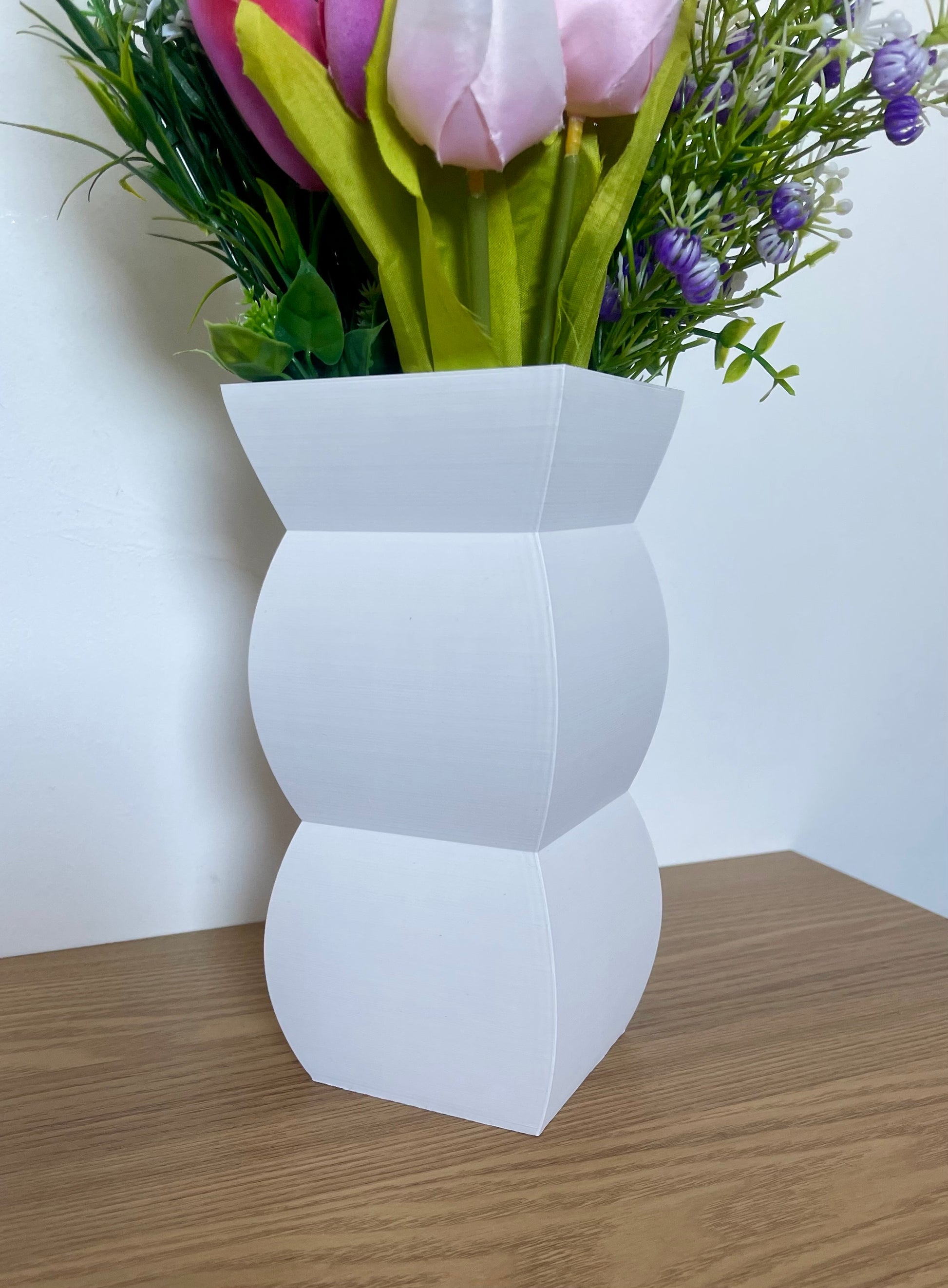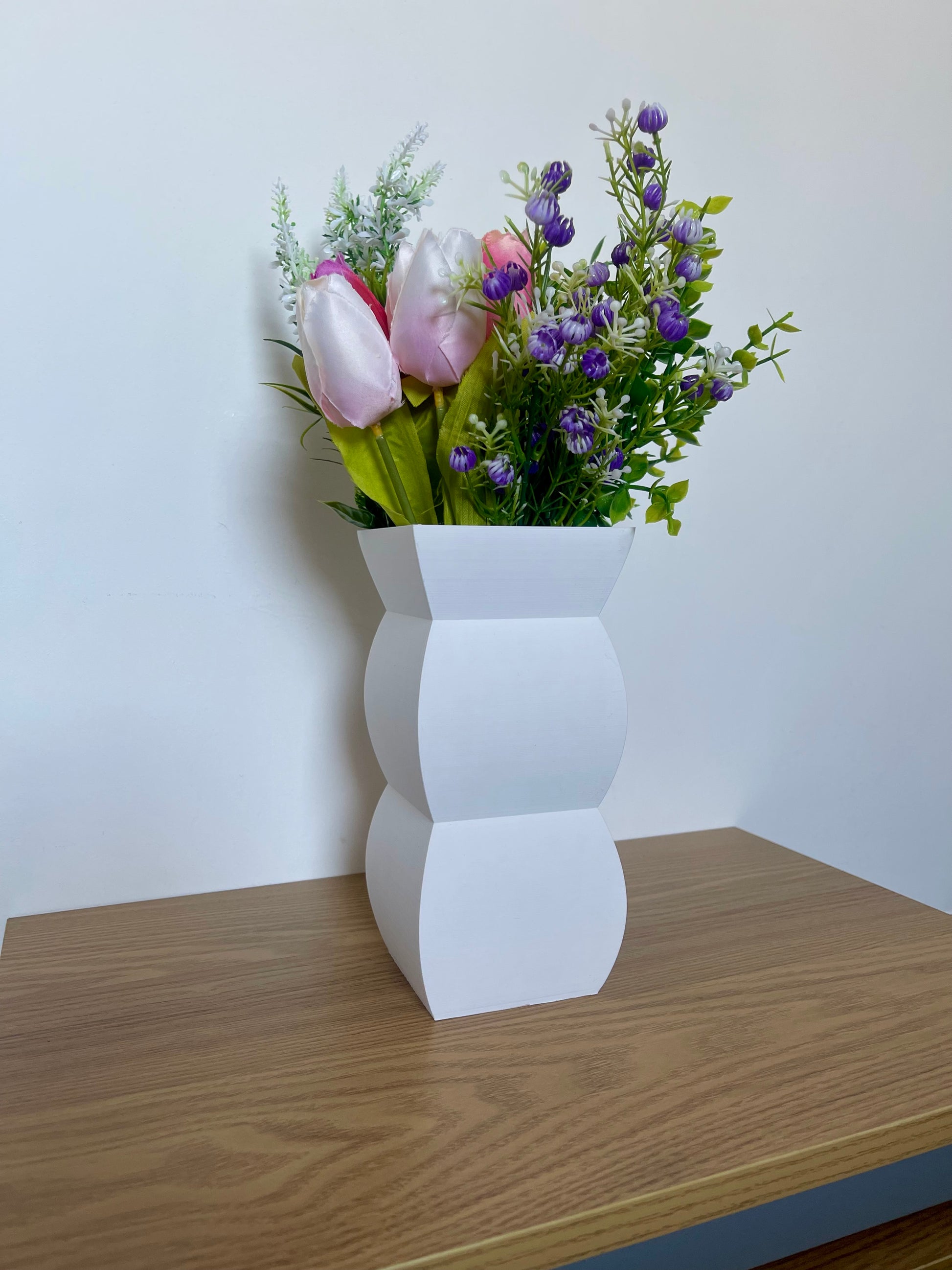 Bring a clean, contemporary touch to your home with this 3D printed geometric vase. Designed with smooth curves and sharp lines, it’s the perfect statement piece for your table, shelf, or desk.