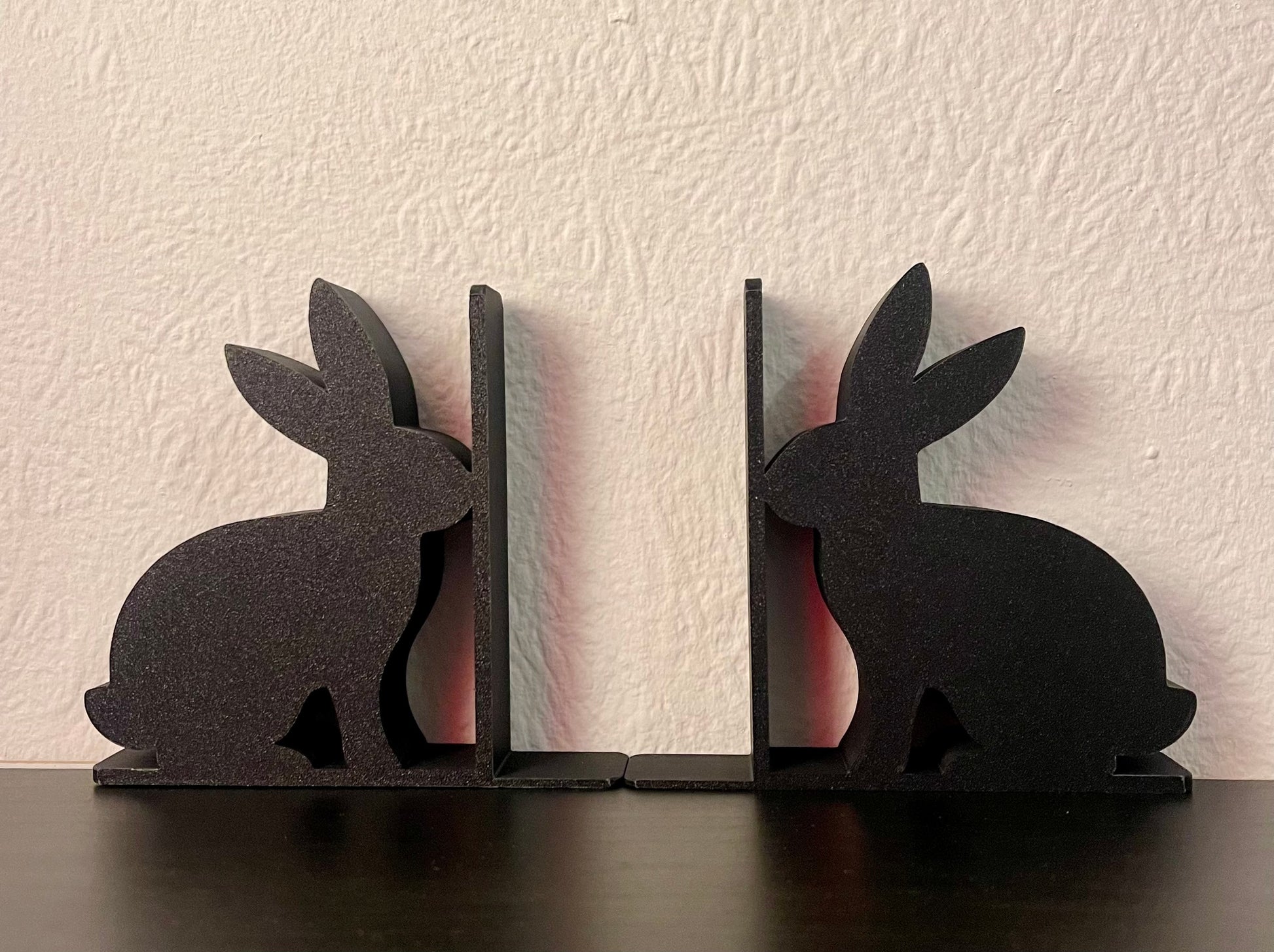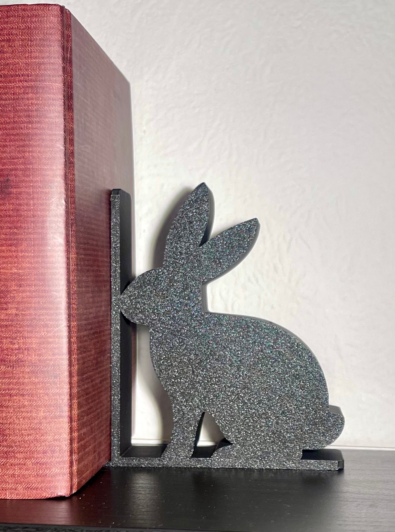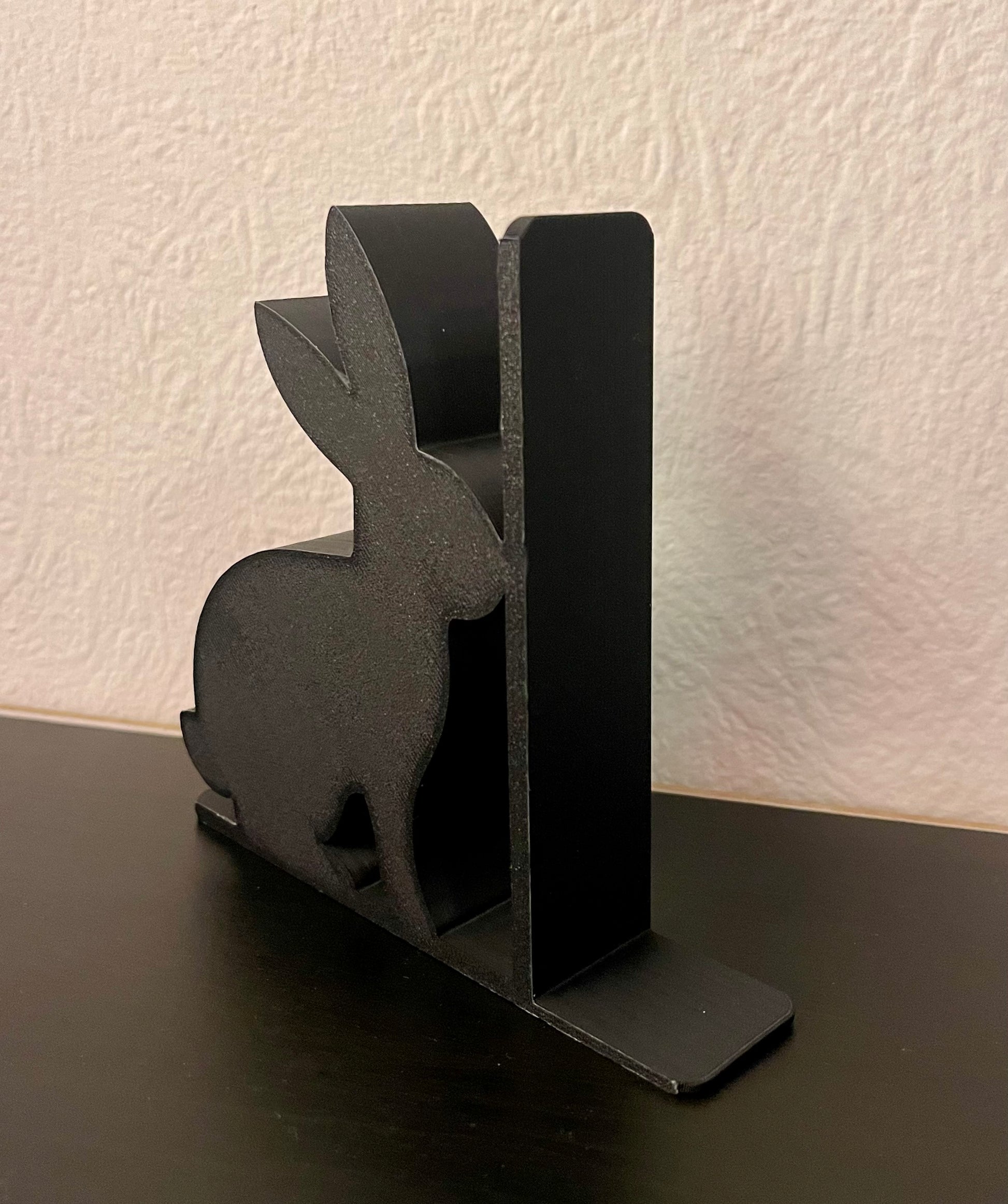 Adorable rabbit bookends for your display of books on a shelf or side table. Set of two stands with slide under book tab for extra support. 3D printed in biodegradable PLA.
