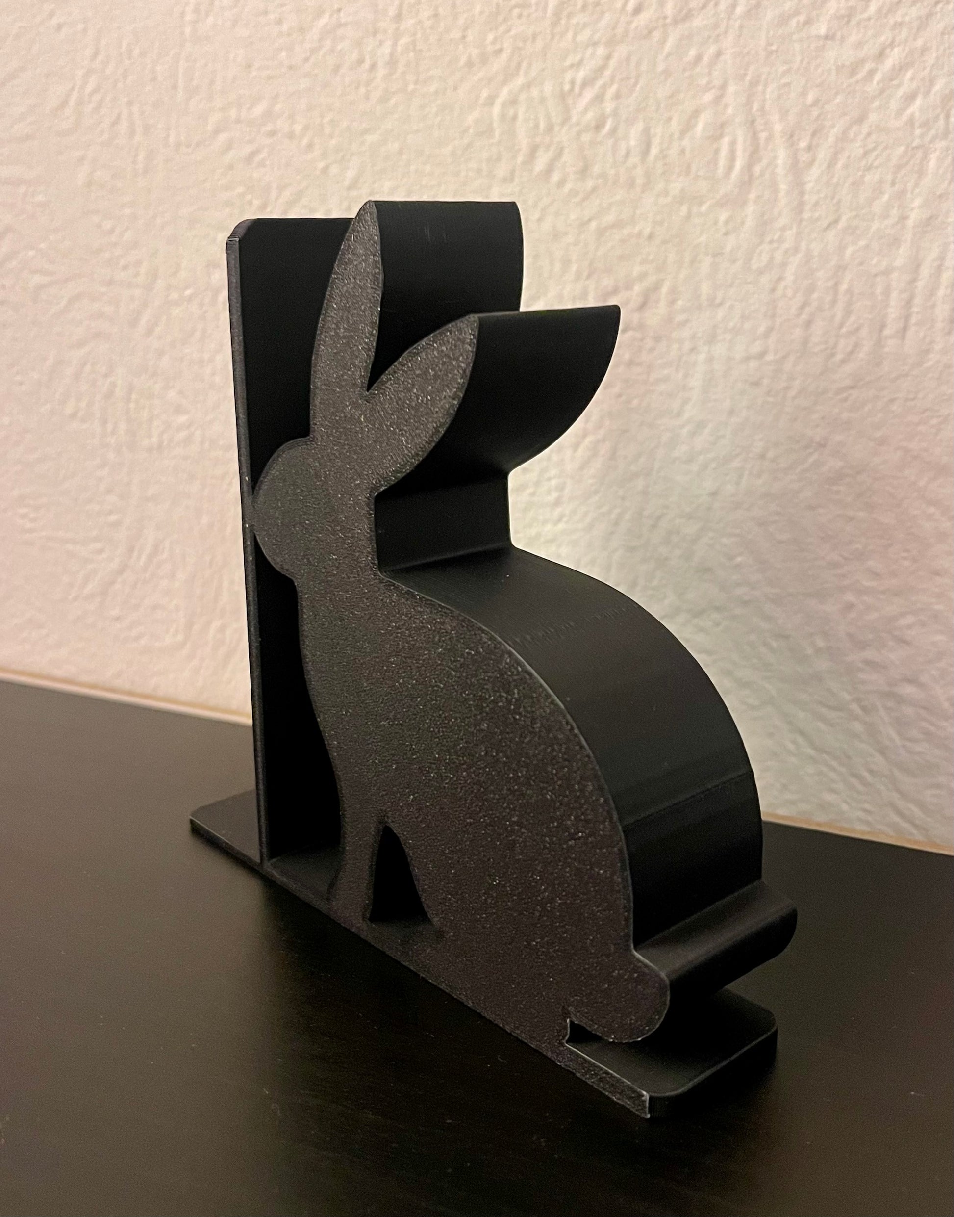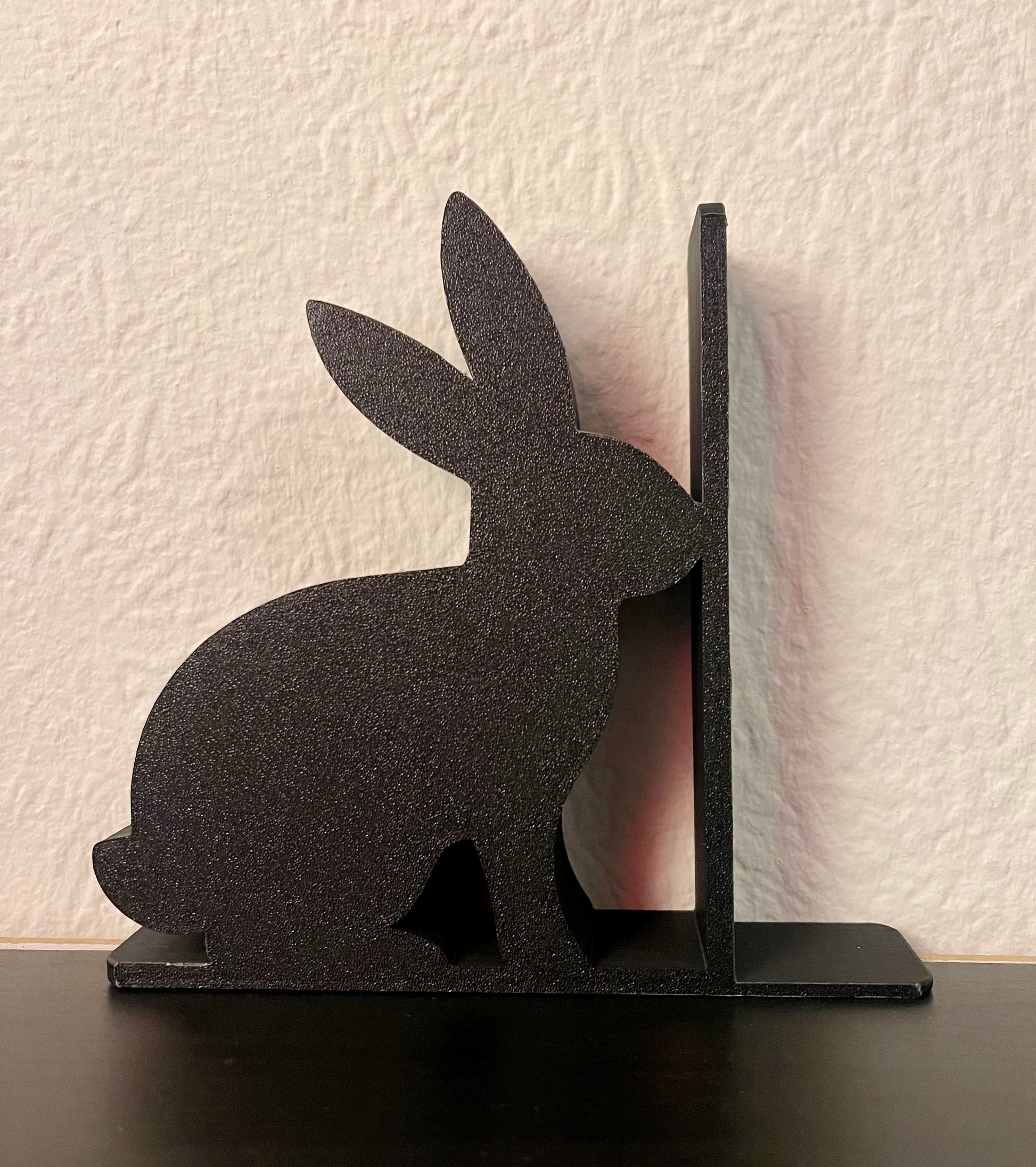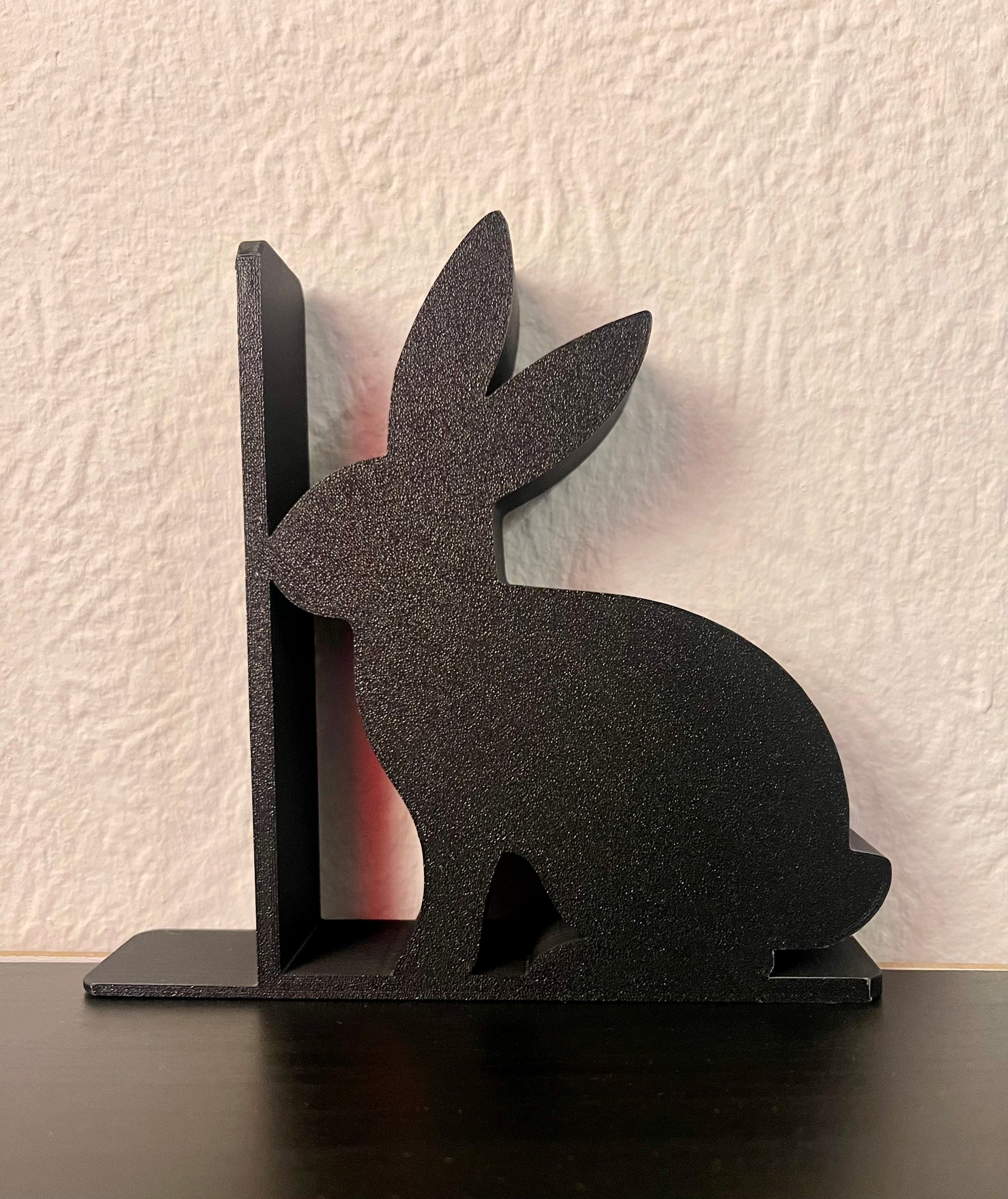 Adorable rabbit bookends for your display of books on a shelf or side table. Set of two stands with slide under book tab for extra support. 3D printed in biodegradable PLA.